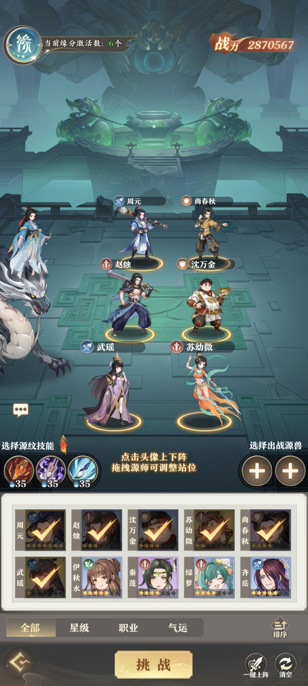 周元专精要满级,保证开局放怒攻,带羽扇给二号位加盾持续两回合,二号位选商春秋是因为商春秋怒攻之后平A有一次回满血的机会(三星天赋)。不能选第二排紫色的毒,选了的话商春秋虽然不会受对面伤害,但是会慢慢掉血掉死。另外我自己打的时候商春秋是死了的,周元第二次怒攻放了,盾给到胖子身上才挡住了对面李纯钧的连杀。需要队伍有一点点练度伤害,保证不被连杀就过了,打不过多试几次,套路没问题。