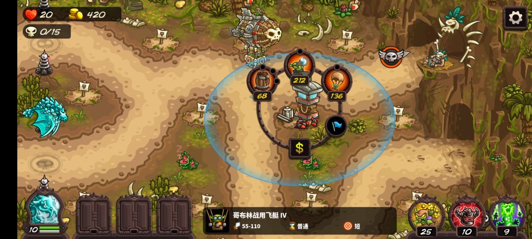 无对空能力!1技能扔出油桶减速敌人60%204金币。2技能提升飞艇附近防御塔攻击范围(大概向外20%)212金币。3技能召唤一个存在一定时间的哥布林打手136金币。