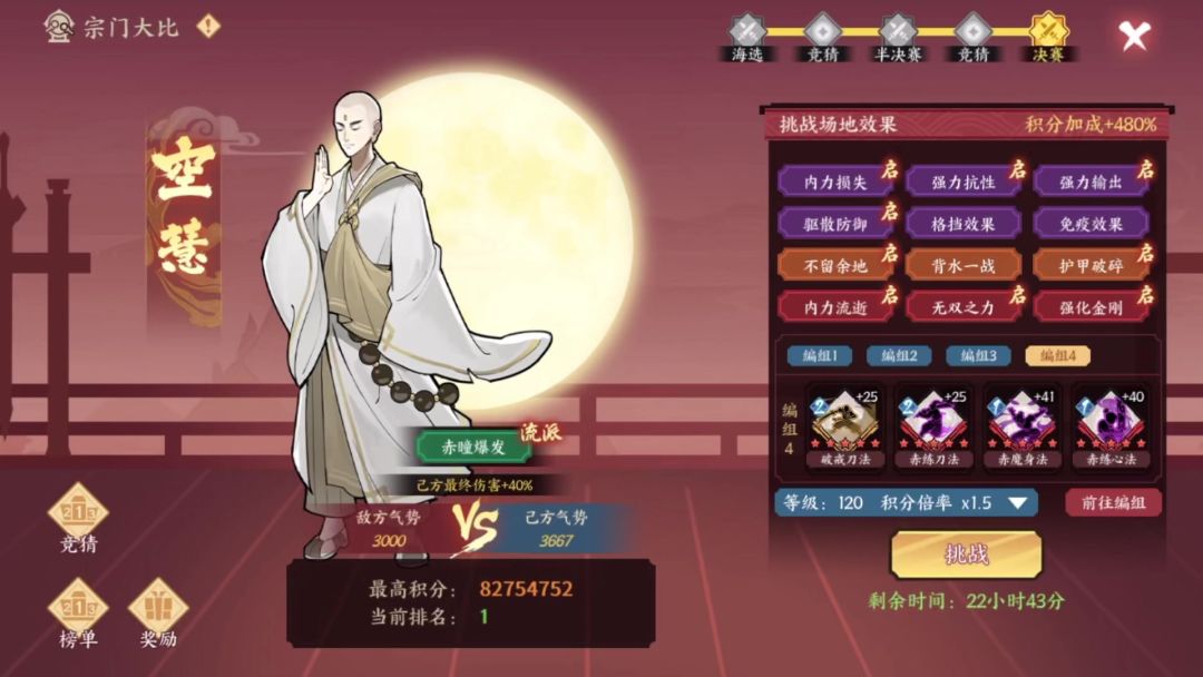 第一回合——刷双膂力舍利,连击鞋给赤虎用,没碰上就留到后面给输出用。结束时内力不高于125。