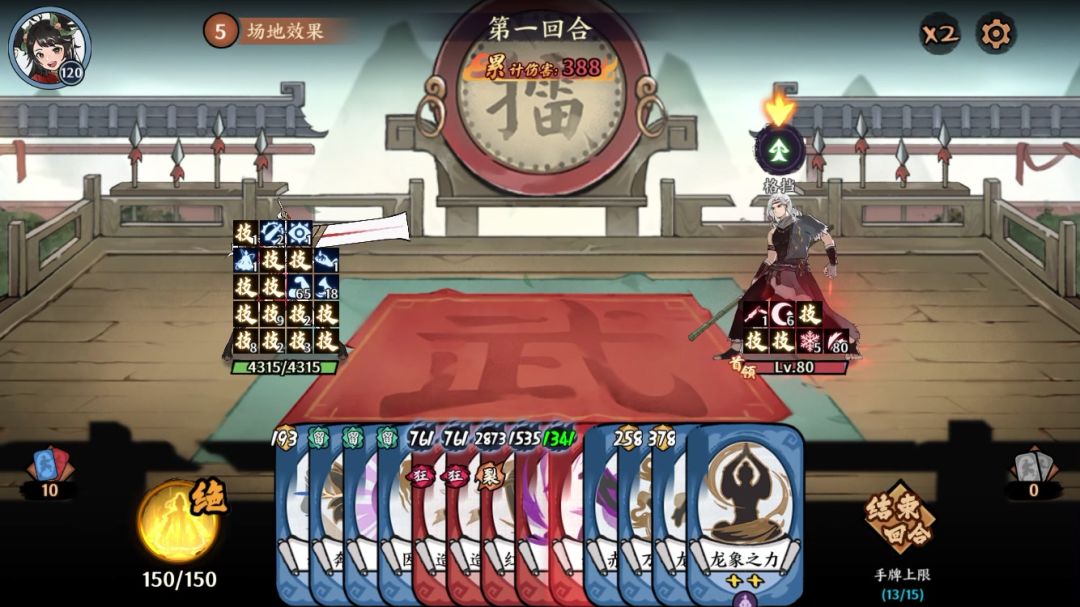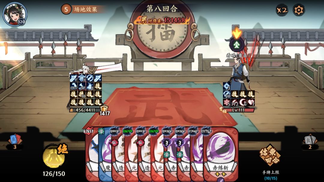 之后就根据不死的数量苟活,期间只用有赤瞳的裂伤招式以及赤霄。最后boss的攻击次数大于不死层数时(没有就是0)所有牌用完。