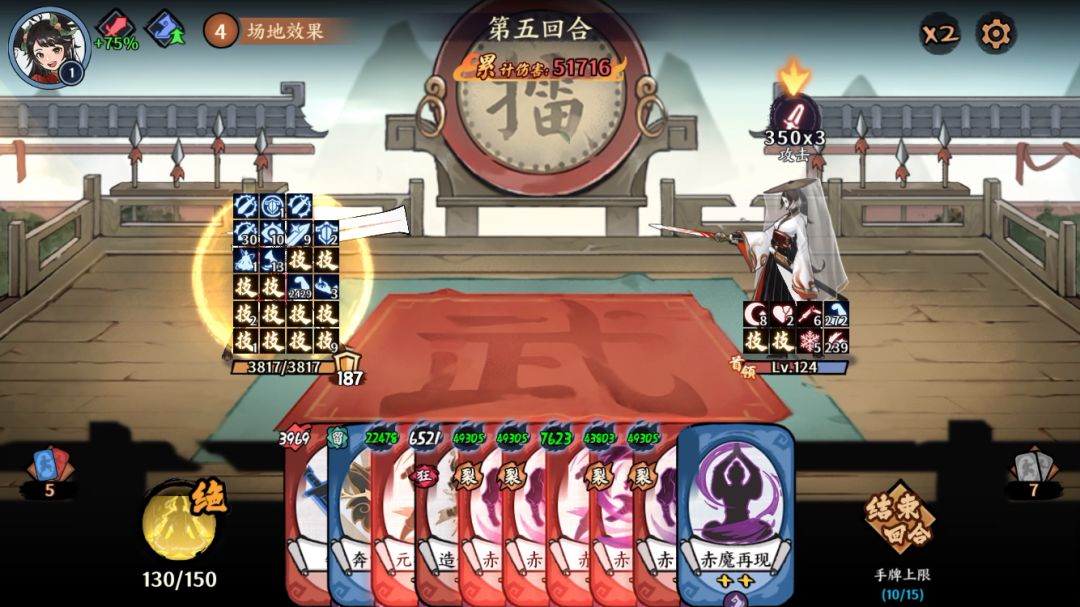 擂台最难凹boss,控分全看脸。减内会导致定膂时内力不足,需要提前满内过轮,其次是没办法频繁使用灵猴舍利,导致控牌困难以及没办法及时回笼因果。而塞牌则会对爆发产生影响,导致经常没办法摸到需要的牌。打法上需要灵活应变,根据伤害选择是否消除伤害减半再爆发。