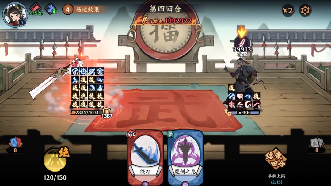 机制第二恶心的boss,吸内、真伤大招,对于本就过牌能力不行的赤刀而言,吸内等于不用放绝技了,全局应该就只有四次用绝技的机会,开局,两次奔雷,赤海。那么该怎么打呢,没办法只能硬打。