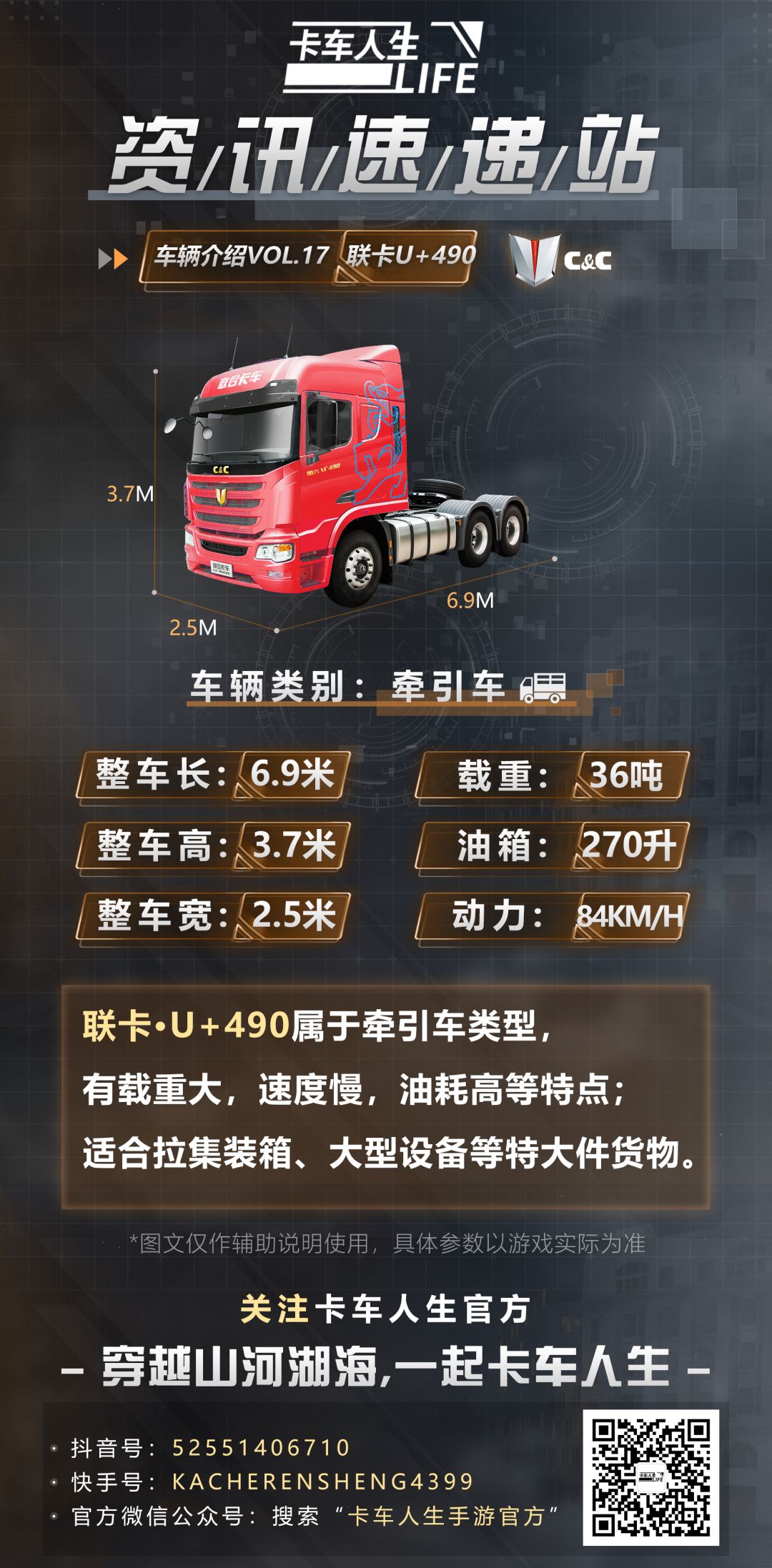 联合卡车U+490是中集联合重卡与《卡车人生》携手推出的首款联动车辆。联合卡车U+车型外形上的亮点之一在于前脸,其前脸保持着与联合卡车标志相一致的盾型,采用三段进气格栅的设计,中网采用了打孔+蜂窝网状设计,这些使得车头更加立体,且更具有层次感,我们也尽力在《卡车人生》对此车型进行了还原。联合卡车U+490有着提速快、爬坡快,同样的路程耗时较短的优势,凭借其马力以及节油帮助卡友们实现运输时效性和经济性的提升。在《卡车人生》中,联卡U+490有着以下两种运输优势:当卡友们角色等级满8级,并使用联卡U+490进行运输,在订单结算时运费获取可提升25%以及经验获取可提升30%,联卡U+490无疑是兼顾升级与提升运费的可靠帮手。