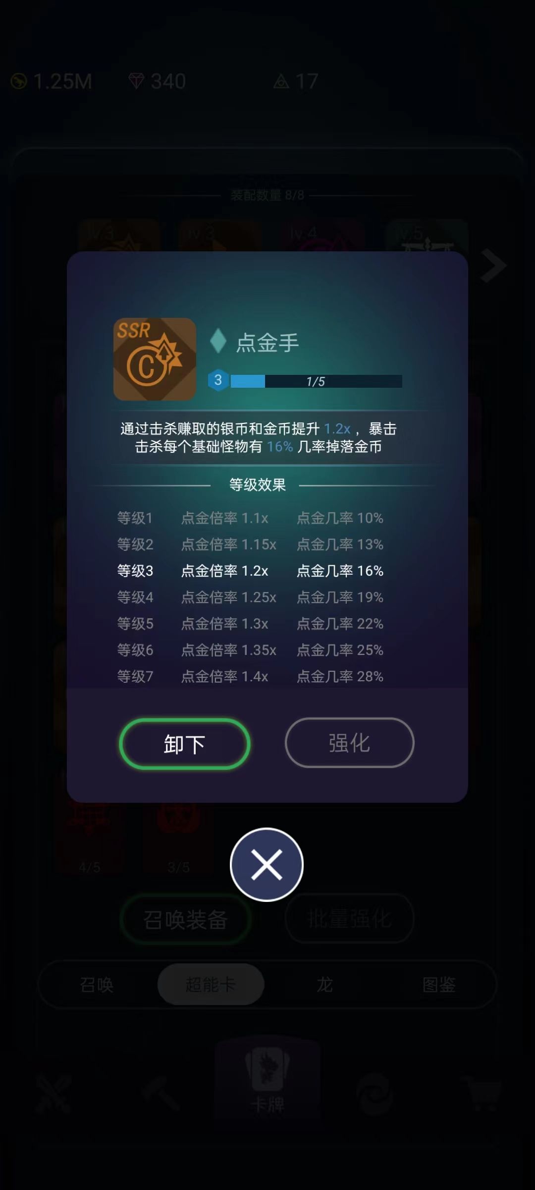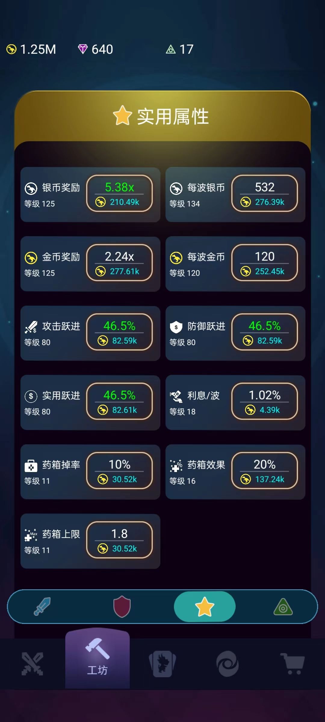 中期:我现在应该就算是中期了吧,宝箱满级6级,抽到敌我平衡(系数增加银币)、银币增幅(系数增加银币)、免费升级(字面意思)、点金石(系数增加金币和提高金币掉落几率),这几个我觉得很棒,必须带!当有这几样东西了以后,每一层银币很多,每一次的金币也会很爽。