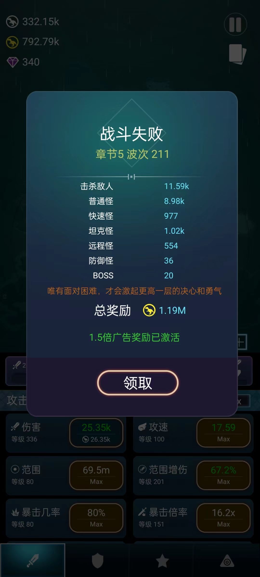 3、很爽:目前打到了9难度,每一把不需要高,把各难度里程碑的金币奖励拿到手我感觉就够了,几M、几十M的奖励,比挂机3、4小时打到难度一的1000关时间短收益高。仿佛打开了游戏的正确方式一样,很爽!很润!