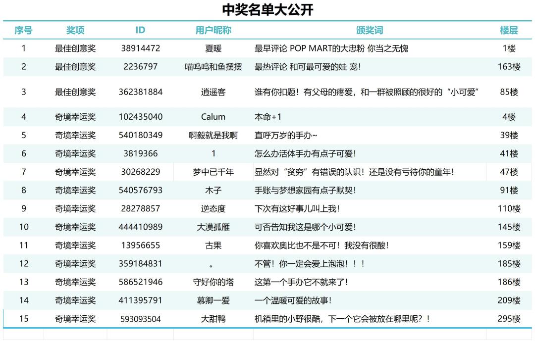“最佳创意奖”管理员们经过激烈讨论由以下3位绘梦师获得。其余幸运小可爱由生成器产生(注:如果没有的楼层数,管理员会顺延至下一楼层,请多多关注自己的ID呦):