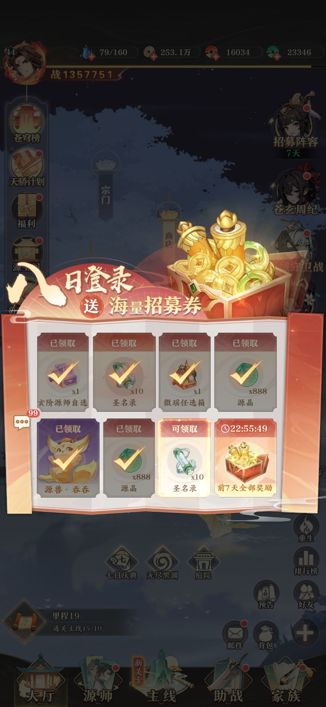 清完每日任务升到45级,推完主线第十五章,领到今天第1次十连抽,周纪里的团购买今天第2次十连抽,日常送的零散抽+源晶补齐今天第3次十连抽,拿下今天的心愿保底。