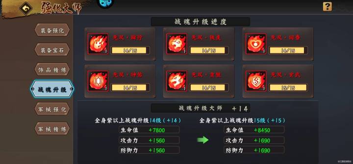 攻击,防御,生命,闪避,命中,暴击,暴击伤害,暴伤免疫,抗暴,个人建议优先堆攻击力,经过测试,平均200万金币可以获得大约1万的战魂经验,同时需要注意强化大师,尽可能做到全套平均同步提升,然后单个优先培养更高,这样利益最大化。