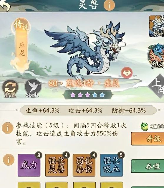 在应龙的技能选择方面,优先考虑强化灵兽,其他弱化灵兽、强化治疗和弱化治疗都是锦上添花的效果。协同技能可以选择应龙来赌输出,也可以用玄武或者鸾鸟来增加容错率。通过这样的技能搭配,我们可以在战斗中更好地发挥应龙的输出能力,同时增加阵容的稳定性和容错率,提高战斗的胜率。