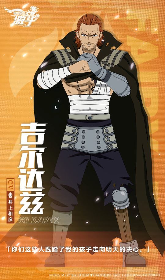 角色背景:吉尔达兹,曾任魔导士公会妖精的尾巴第五任会长,是妖精的尾巴最强的S级魔导师。因为其“粉碎”魔法会无意识的将周围的建筑物破坏(进公会时从不走正门,都是破墙而入),所以当吉尔达兹行走时,街道会变为“吉尔达兹模式”以防他会冒冒失失破坏掉街道,因此全镇人民对于他每次回来都相当慌张不安,人们称之为“那个老爹”。