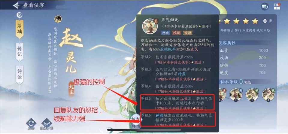 6号位紫萱——怒招天幕,均摊伤害,而且天幕期间死亡给其他侠客增加攻击,死亡后会复活已经死亡的全部侠客,战力指数S,恶心指数SSS