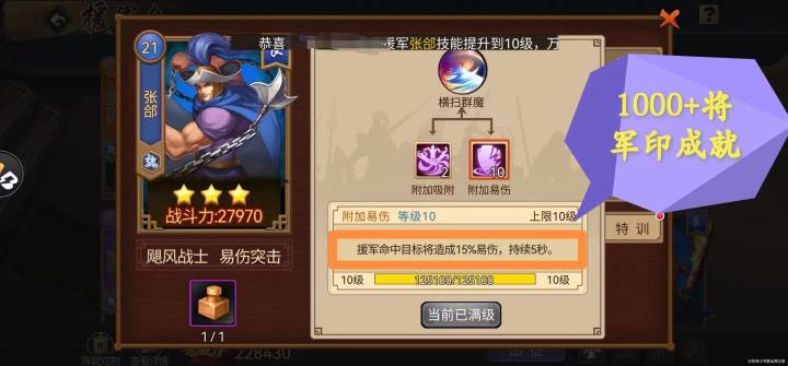张郃 特点:1星后激活大招,带吸附和易伤效果,随着特训技能的养成,吸附和易伤效果会增强; 优势:吸附带一定的聚怪效果,辅助集火群伤,5秒百分比易伤(易伤特训只加强百分比,持续时间都是5秒),召唤出场释放两个大招就带10秒的易伤效果,组队双方均带援军张郃,双向互切,对整体输出效率的增益,那确实是妥妥的; 运用前景:在蓝色改版前张郃绝对是蓝色品质援军的话事人,毕竟带吸附、破倒地、增伤、强控等特性是副本最需要的技能!张郃易伤可作用于全副本场景!不过到10级易伤特训,总共需要1200-1500将军印开销,这差不多抵得上3星极品援军大招1-3级的将军印经验值了…因此作为过渡型援军,适当培养易伤即可,毕竟将军印留着后续培养即战力更强的3星极品援军,或许性价比要更突出一些,虽然3星极品援军在普通玩家不拆解饰品的前提下,确实需要时间去过渡,但3星极品援军总归会有的!何况谁也不知道蓝色和紫色品质援军最终会改版成什么样子,假如有异军突起的同品质或高品质援军呢!