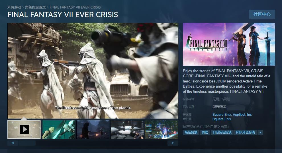 《最终幻想7:永恒危机》Steam商店页面现已上线,上线时间待定,不支持中文,锁国区,该作是《最终幻想7:永恒危机》手游的移植版。
