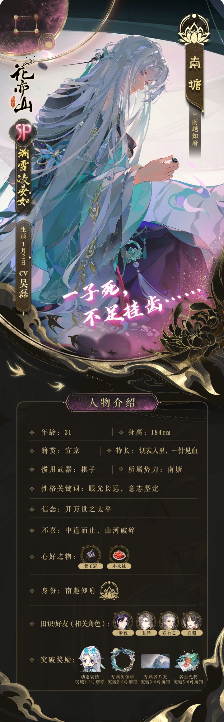 曾为大景内阁首辅,后变法失败,被贬往南越,时任南越知府。