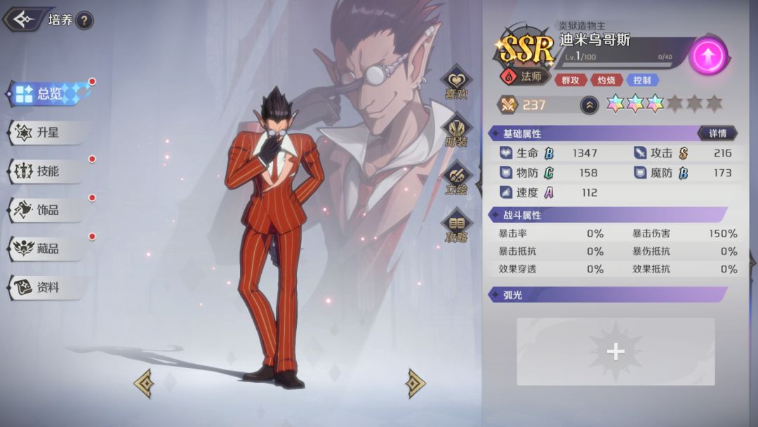 灼烧流派:【灼烧】状态为核心的流派,通过角色之间的配合,打造【灼烧】环境,并利用一些角色在【灼烧】环境下的高输出能力打出高额的伤害,形成技能的联动。灼烧队的核心主C为SSR卡牌的迪米乌哥斯,可以通过新手卡池稳定获取,其他角色均为SR卡牌,获取和培养难度极低,非常容易成型。