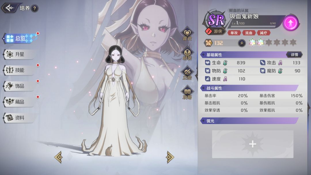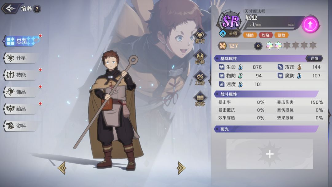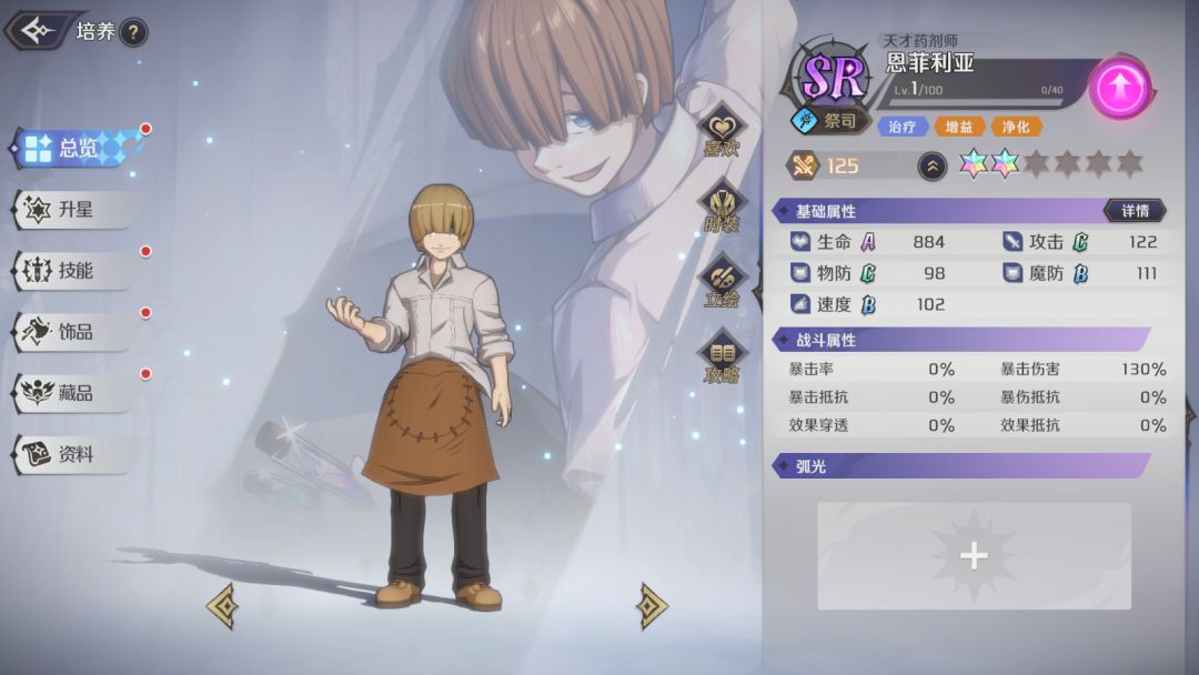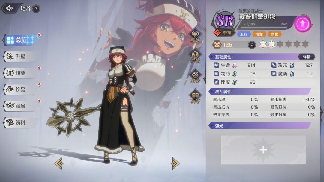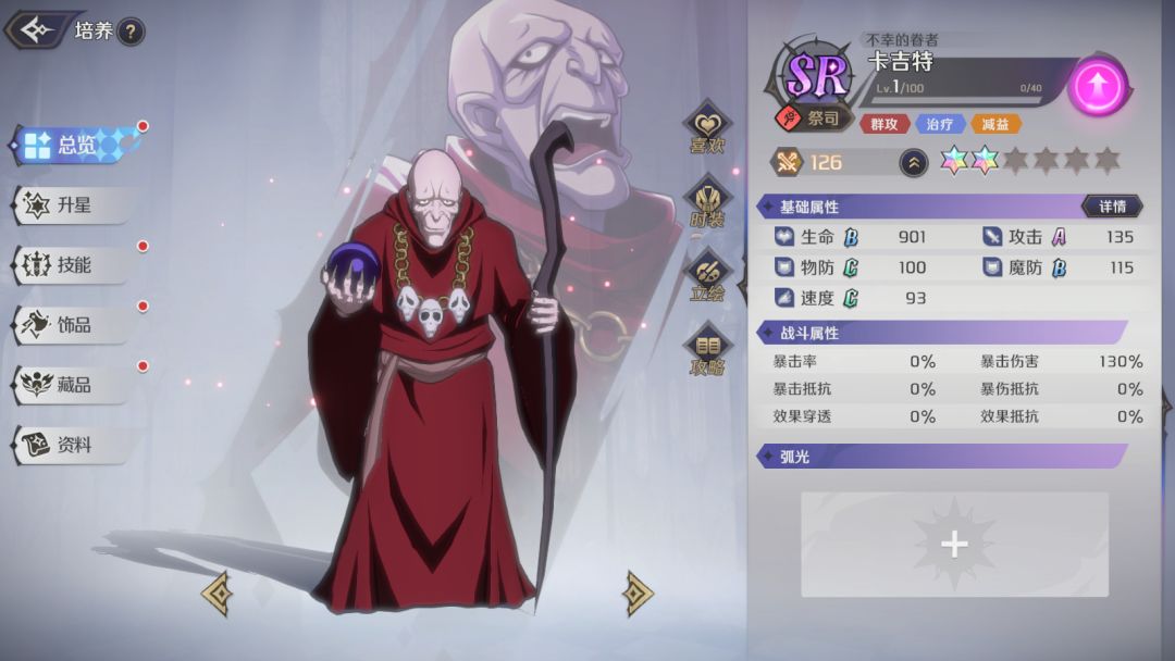 英雄评价:提升队伍防御,拥有群体治疗,附加给自身和队友随机附加【攻击提升】、【防御提升】、【速度提升】、【暴击提升】随机增益状态,净化减益状态;