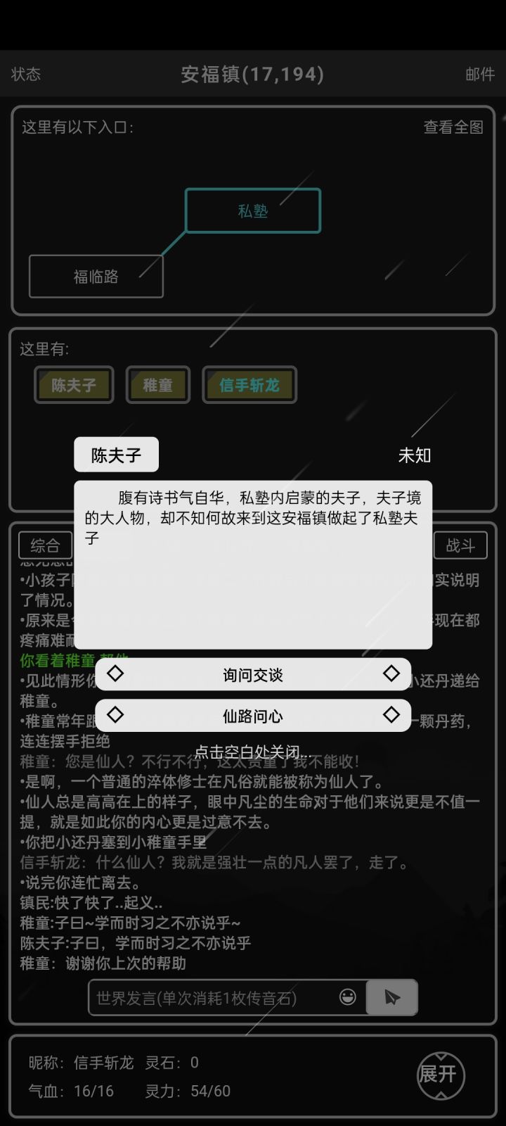 陈夫子这里有一个《仙路问心》的任务,总共5道题,都是公务员考试的题,比较简单。按照人物等级给经验,每天一次。必做。