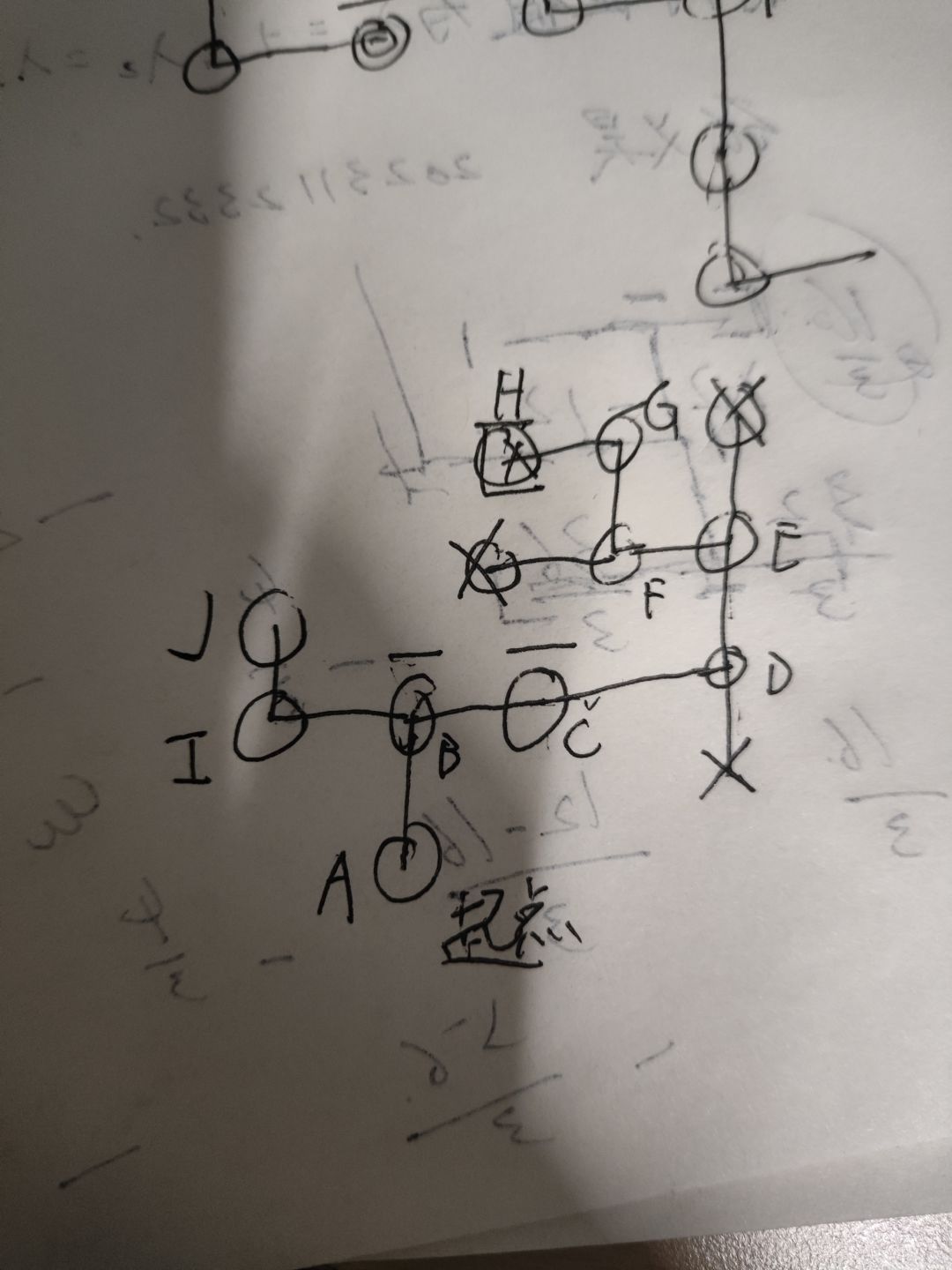 向下是来路,尝试向左到达节点I