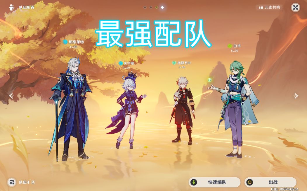 搭配:那维莱特(1命最佳)+水神(1命最佳)+枫原万叶+白术(实在没,其他瞬补奶也行)。
