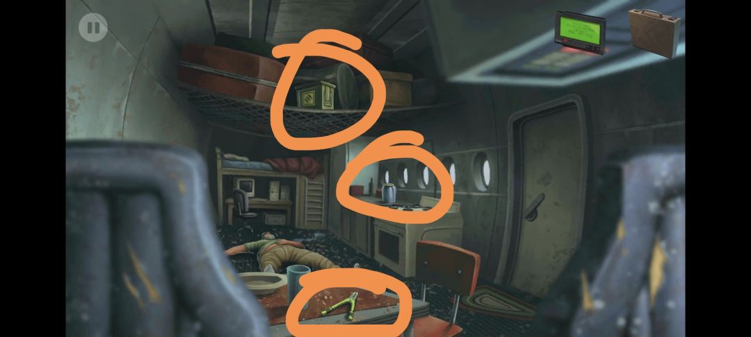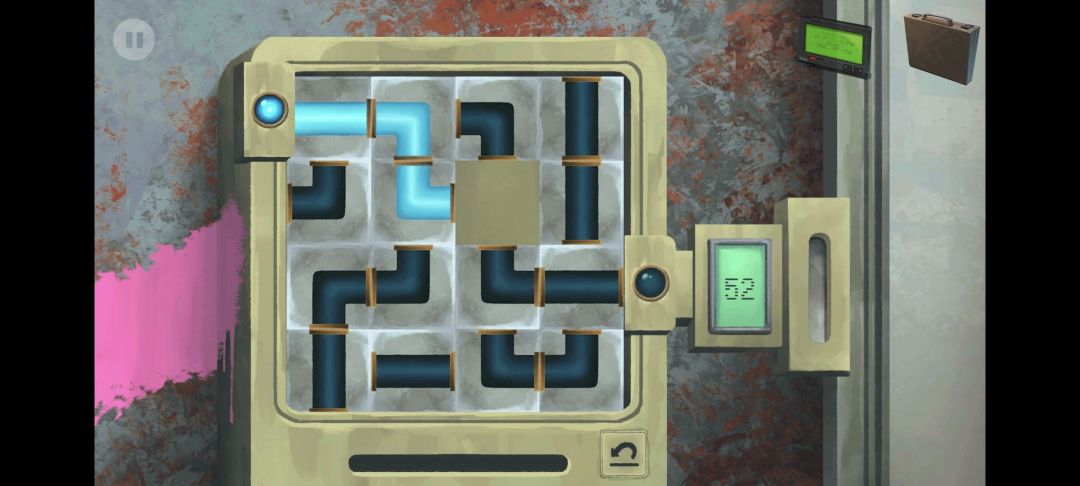6.拾取油桶上的软管,点击飞机的门。通过小游戏开门(通过拼图的操作使两个点连通,要求 99 步以内)。我的接通路径:最后一步为下。