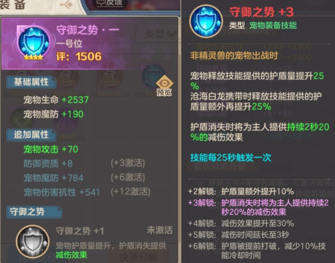 守御之势套装,这个套装虽然作为过渡性套装,但是不得不说套装技能很强,提升普通宠物释放的护盾量25%,提升魂兽白龙的护盾量25%,护盾消失还提供最多3秒30%减伤。很明显,这个套装对于前期护盾宠物暴雪兔,冰甲熊,帕拉丁以及新出的魂兽沧海白龙来说是量身定做的套装,能让你变得更抗揍,这对于前期pvp竞技玩法来说,守御之势套装是非常实用的套装。