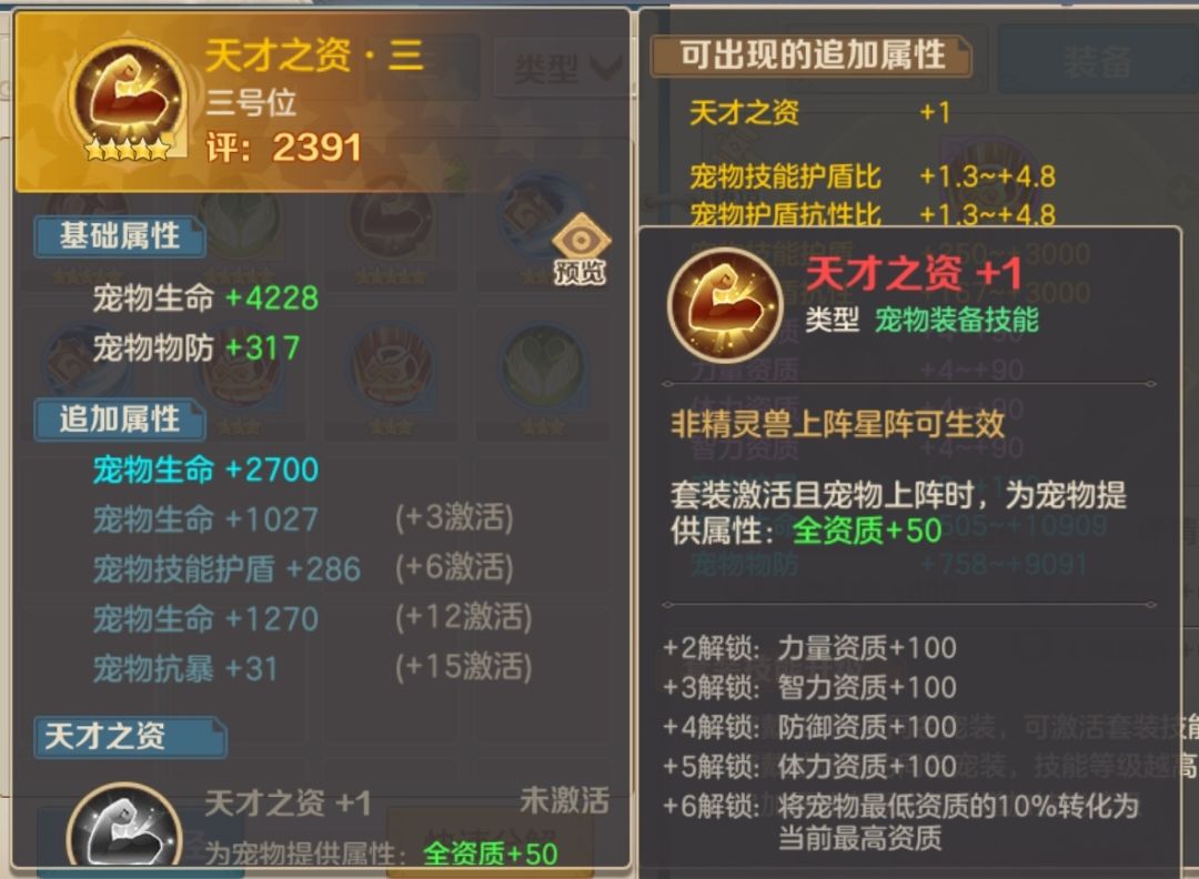 天才之资这个套装应该是这四个套装里面我觉得最鸡肋的套装了,主打的是提升宠物资质,最高增加宠物力智防体150点资质,技能拉满能转化最低资质10%为最高资质,用在主战宠物增加宠物的这点资质实际提升是非常小的,对比前面三套来说就显得十分鸡肋,如果是丢辅助位宠物拉资质增加高级属性,这个新宠物装备又洗不出人物属性,肯定是比不上六合之力套装,所以这个套装是新宠物装备里面最没有用的套装,不建议使用。