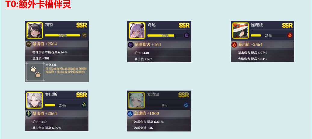 总的来说伴灵没有固定搭配,都是根据自身需求来选择,以上内容也只是最基础的伴灵搭配分享,新玩家和普通玩家比较适用。