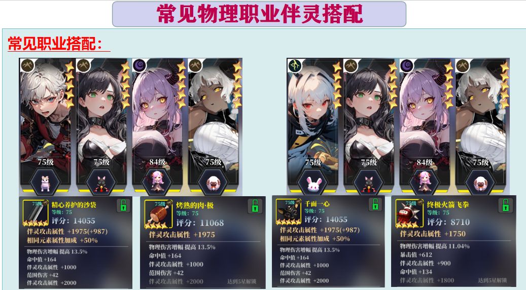 更深层次的搭配会涉及到《伴灵武器》《属性克制》《套装搭配》,但是也需要时间和资源的积累,目前只有少数玩家有这种需求,这里就不做过多赘述,主要是多写一篇就多......