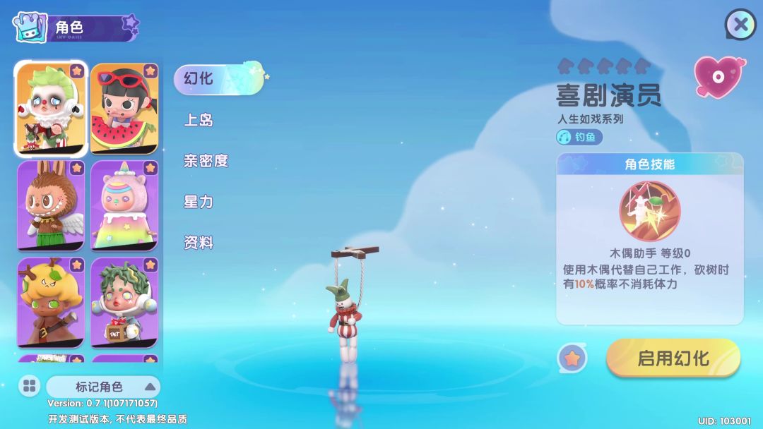 使用SKULLPANDA喜剧演员的幻化,可以操作木偶进行砍树、采矿、浇水种田,并且有几率不消耗体力;