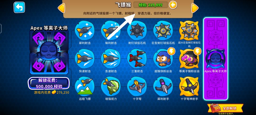 高级挑战需要图钉塔才能过,获取经验的方式只能打气球获取。而且只是是上场猴子才能获得经验,需要解锁前一个技能才能开启下一个技能的解锁。