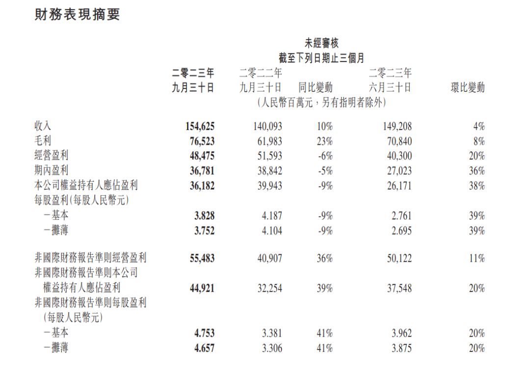 据财报显示,受2023年经济复苏和业务精进影响,腾讯Q3营收总额约为1546亿元,环比上升4%、同比增长10%;其公司权益持有人应占盈利约362亿元,环比上升38%、同比下降约9%。