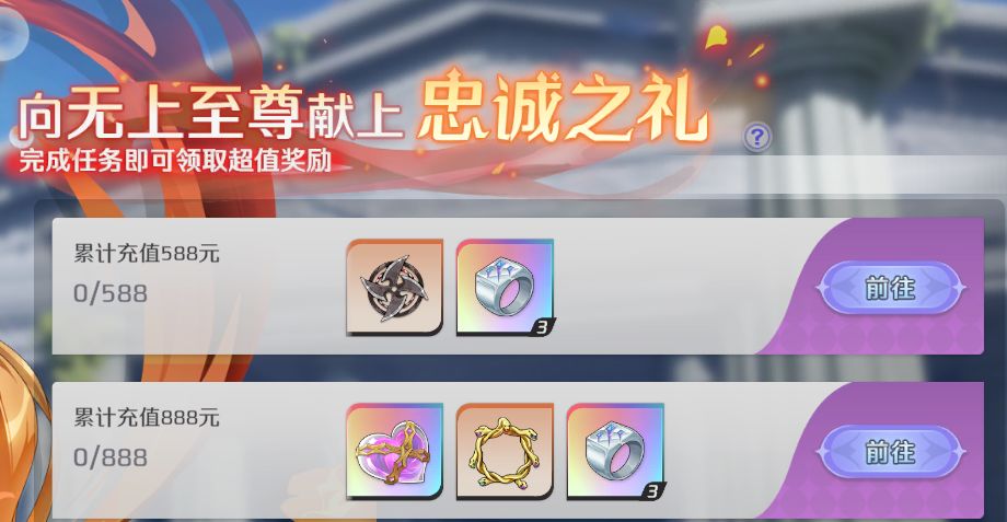 评价:中氪玩家如果是根据攻略走,只能激活到¥1688这个档位的,差¥131就可以激活¥2188的档位,那么这个时候是比较推荐各位至尊们购买服装券礼包(永久限购)1次,再直充¥98(双倍返还钻石),去激活¥2188这个档位。各位至尊还有余粮的话,咱们可以在直充1个648,因为钻石是双倍返还的,非常非常划算;忠诚之礼的物品全都拿下后,资源已经和80%的至尊拉开差距了。