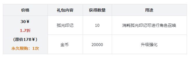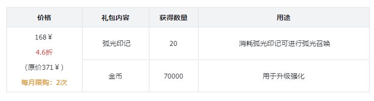 礼包评价:前中期能够获得弧光装备的途径不多,通过抽卡能够快速的获取,提升队伍的整体战力(主推优先艾伊维尔艾,副白金铠甲),可以快速和其他至尊拉开差距;