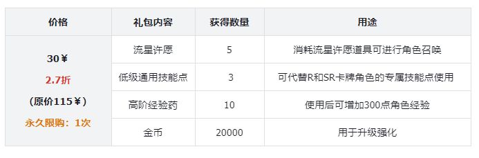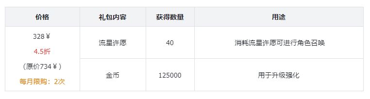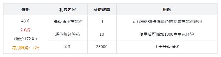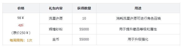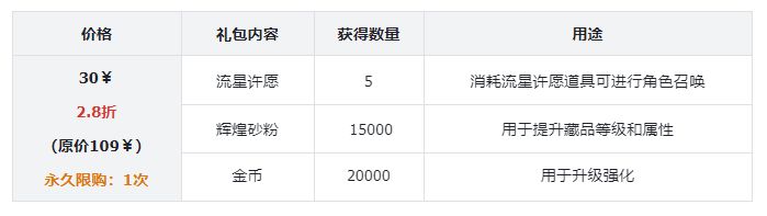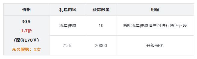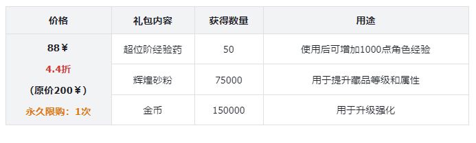 礼包评价:性价比比较高的一个礼包,可以节省刷副本的时间,还可以快速的刷材料、刷藏品、刷金币,这些权限在前期的发育阶段十分重要,可以快人一步。