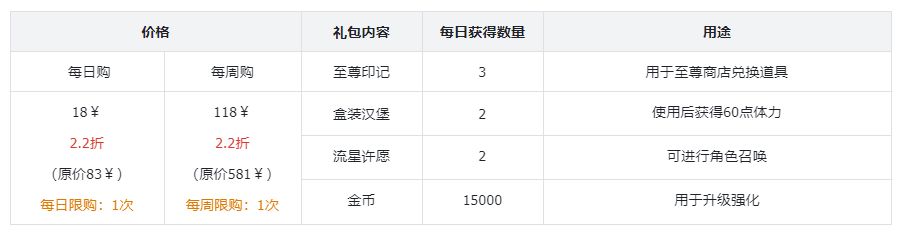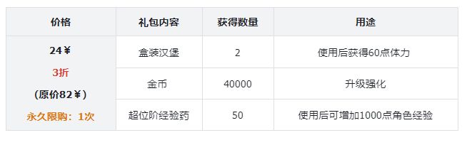 - 汉堡礼包赠送50个超位阶经验药,获取同等价值道具需要刷40次巨岩之渊,汉堡礼包为至尊大人节省了800点体力值