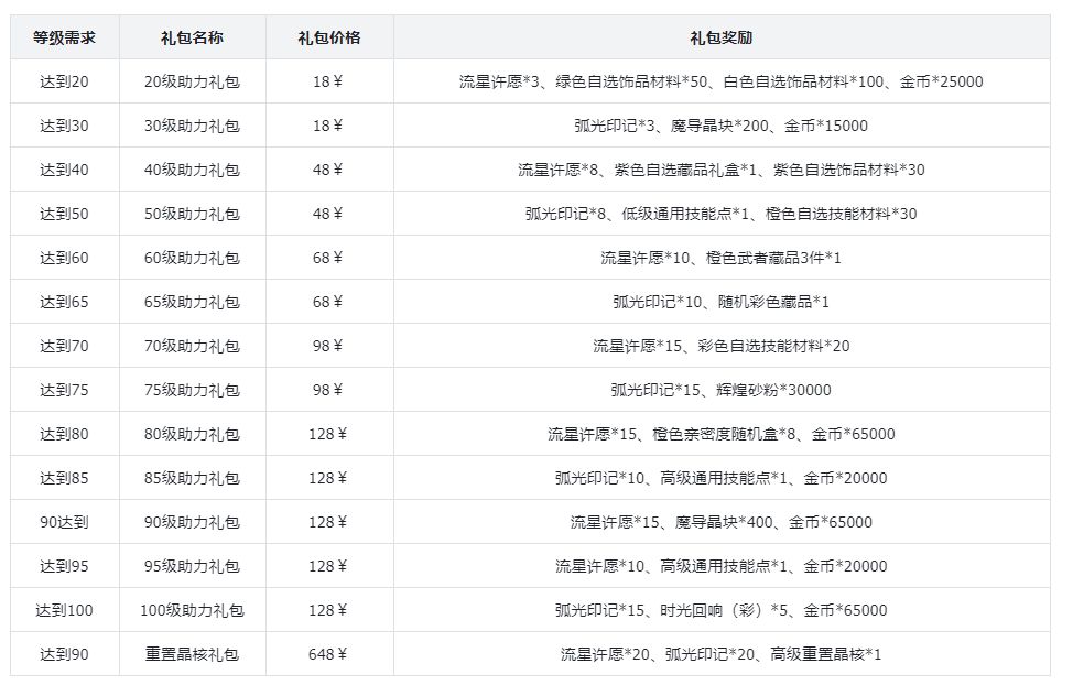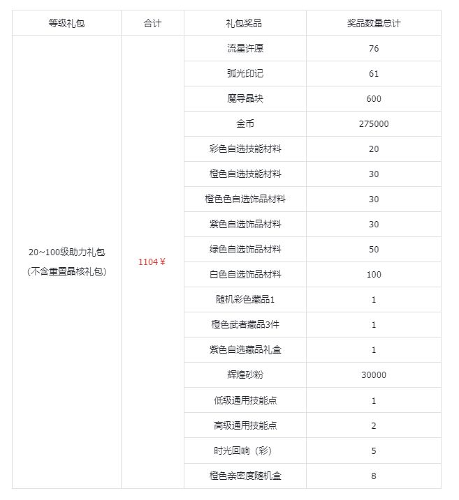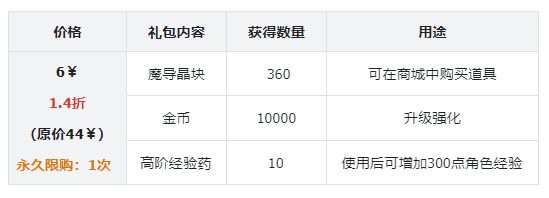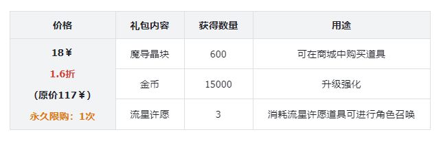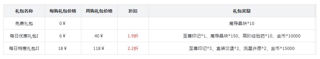 价格礼包内容获得数量用途0¥每日限购:1次魔导晶块10可在商城中购买道具