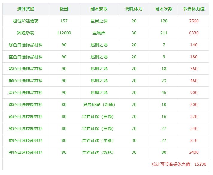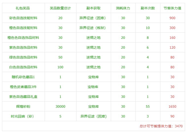 - 同时第2天可以领取75000个辉煌砂粉,刷宝物库138次才打出75000辉煌砂粉,首氪礼包次日为至尊大人节省了4140点体力值