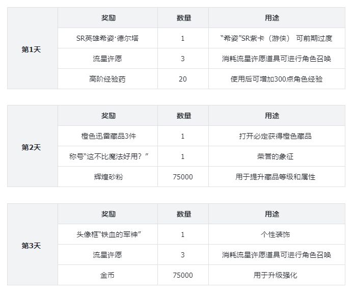 评价:额外获得的钥匙,在副本可以直接扫荡,节省大量时间,从而发育时间也大大减少。3点普通技能点也是非常的实用,可以给SR英雄使用,提升英雄战力。