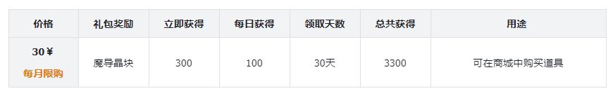 开通后,立即获得魔导晶块300颗,在30天内每天可获得魔导晶块100颗,一共获得3300颗魔导晶石