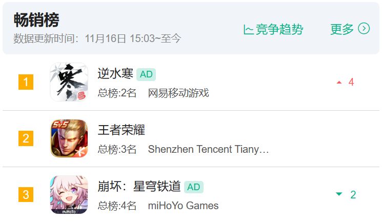 网易首款自主开发的篮球游戏《全明星街球派对》,同时也是首个不上线安卓渠道的网易游戏,在前不久10月25日登顶国区畅销榜;《巅峰极速》目前仍位于畅销榜前列,且已多次进入前十,最高至畅销第三位。