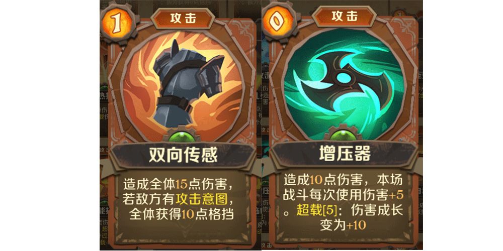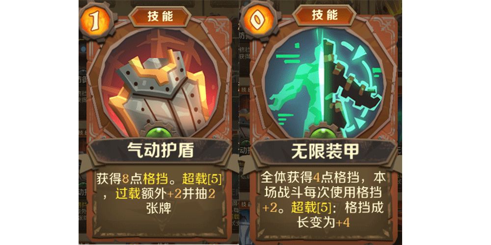 秘技卡“引力盾”,触发超载可以获得大量格挡值,虽然写的是攻击卡,但是实际上是防御神卡,配合专属卡可以在前期轻松无伤