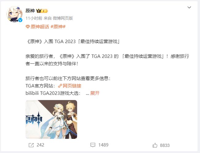 今天,官方发布了一则公告,《原神》入围了TGA 2023「最佳持续运营游戏」的提名。