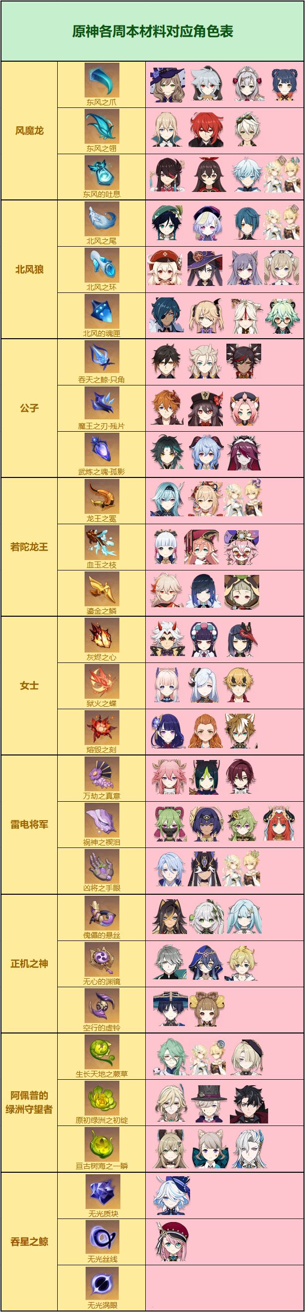 截止目前4.2版本,原神各周本材料以及对应角色,如下图所示: