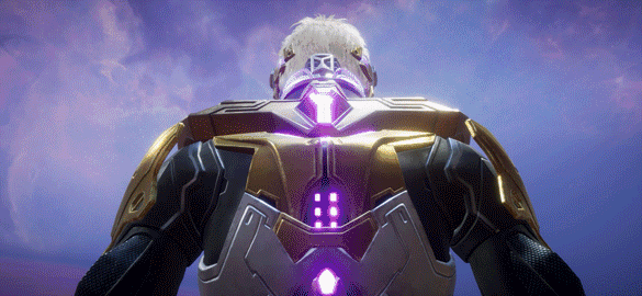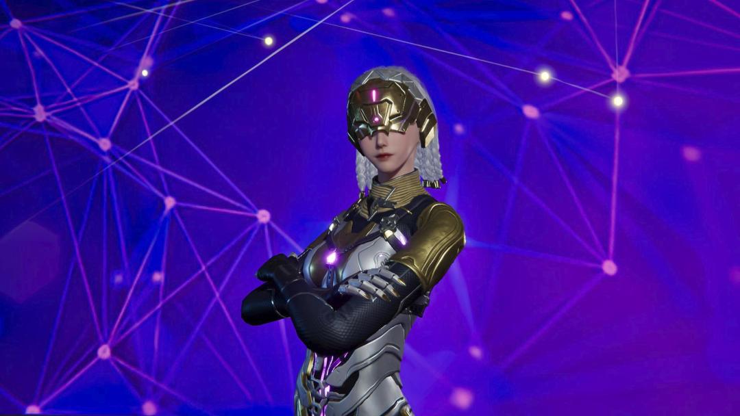 金色品质时装【蓝蚀仿生人】以白金装甲覆盖全身,紫色流光在其间闪烁,上身就是科幻电影中的真·仿生人。