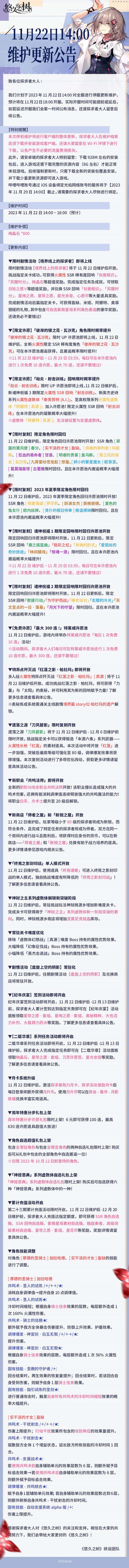 我们计划于2023年11月22日14:00对全服进行停服更新维护,预计将在11月22日18:00开服。实际开服时间可能提前或延后,如若延迟开服我们会第一时间公布消息,还请探求者大人留意后续公告。