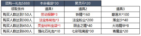 【活动简介】活动期间内,道友们可购买活动界面的团购商品。当购买团购商品的人数达到一定数量时,购买过该商品的道友们可以额外领取相应奖励。