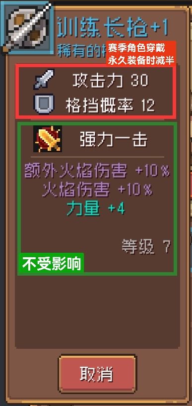 村长:永久角色穿戴永久装备无影响,穿戴赛季装备也无影响;赛季角色穿戴赛季装备无影响,但当赛季角色穿戴永久装备时,装备基础属性会减半,但装备词条不受影响,装备羁绊正常生效。给大家掏出我珍藏许久的长枪做个示意吧!