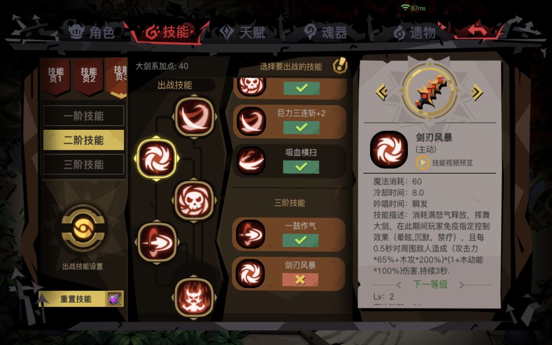 二阶技能:旋风斩(重要!)、树王、三连斩、生命专精、破碎终结(k头王)、(吸血看情况点)