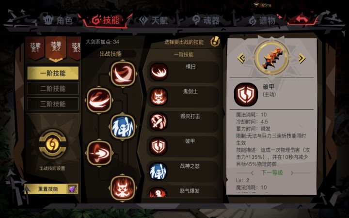二阶技能:吸血、三连斩、生命专精,树王。(破碎终结点一点即可。)