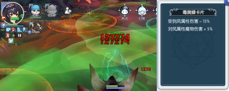这里需要解释下,强烈不建议衣服换成防御的,我这里是因为我没有五属性防御的影子盾和雷神卡,所以我用了30%风免的衣服,雷神由于缺少穿刺和物伤,所以强烈不建议把衣服换成防御的,非常影响伤害这里看到多了30%的减免之后收到的伤害已经为原来的1/3,正常情况下副手影子38%*0.3=11.4%,影子开了50%之后为19%,加上工会8%已经能做到站街150%风免,此时倘若你有雷神卡,或者你愿意舍弃副手输出卡,换成黄蜂卡。此时风免能达到165%,那么我认为幻龙大圈炸你只会掉一丢丢血,丢失的物理伤害可以通过生化巴风特和附魔弥补。